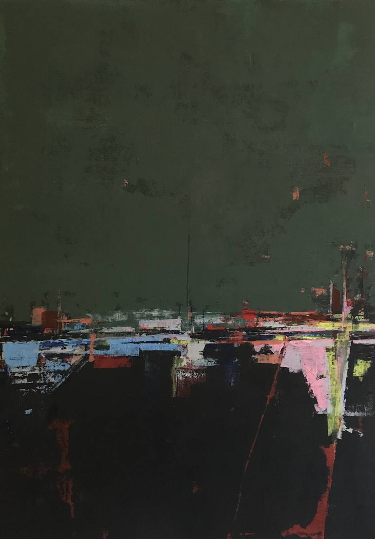 From a series of paintings inspired by the horizons of Scotland - looking upon the towns and villages across the amazing waters and landscapes. This painting is capturing the magical moment when the day light fades and while city street and building lights become stronger, reflecting and interacting...