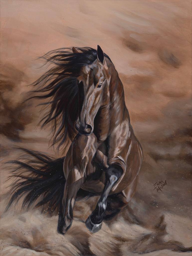 Dusty: A beautiful Stallion running in the wind stirring up dust. My goal was to provide an image that conveys his beauty and movement. Acrylic and, Oil on Canvas. ABOUT IRMA MASON Irma Mason Irma Mason is a native of the Midwest but spent a lot of time traveling between Indiana, Ohio, Pennsylvani...