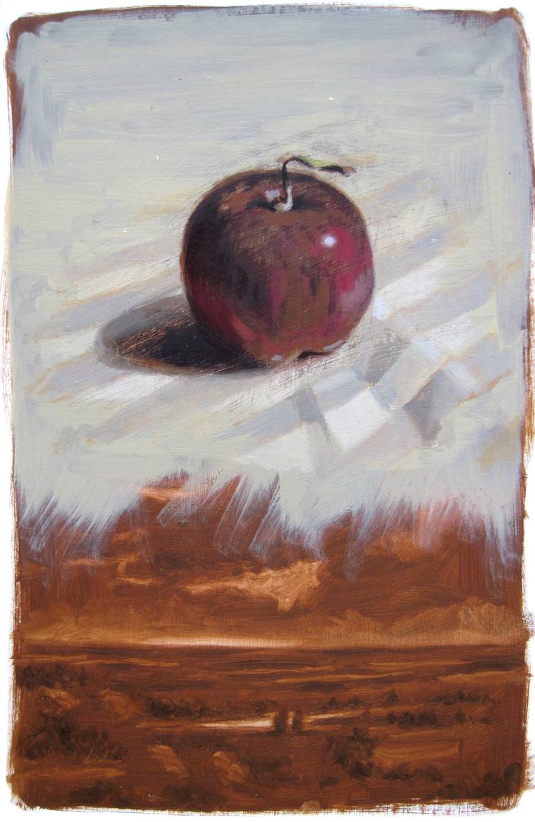 The painting evolved from a desire to find inventive ways to fuse traditional still life forms with landscape and figure. While the "figure" is absent from this work, the playful fusion of the apple on cloth hovering over the dutch landscape provides an interesting juxtaposition. The oil is applied...