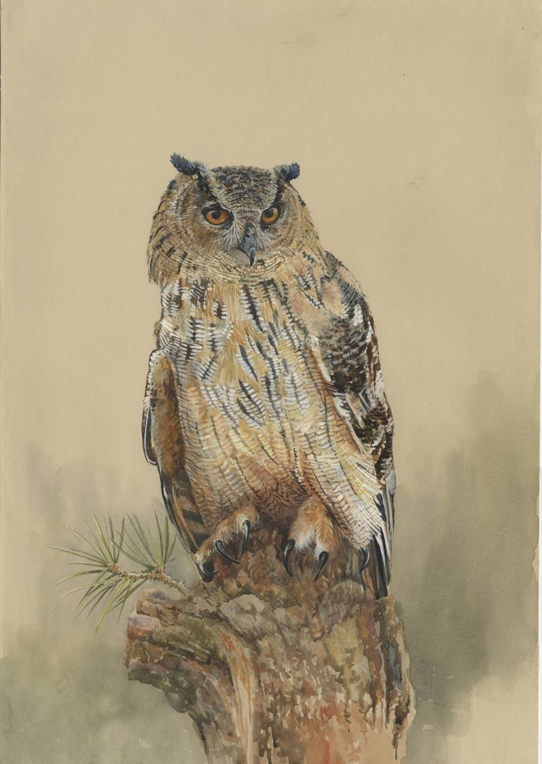 Eagle Owl. Original Watercolor Owls are fascinating! I love to draw owls and I will draw them again and again! This eagle owl is drawn on special high quality tinted watercolor paper.