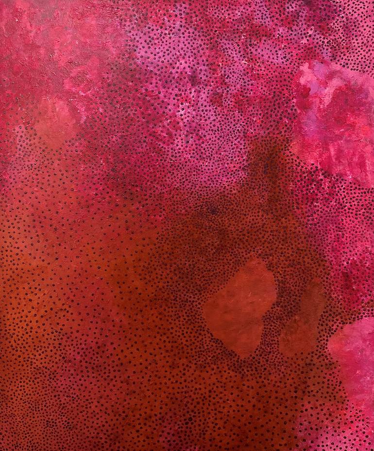 This painting speaks to us about heart and earth through the colors pink, violet and the shades of fucsia that seems the veins and the heart conformation and the iron oxide us brown that is telling us that where are not heart beat the land is desolate and no life form will grow.