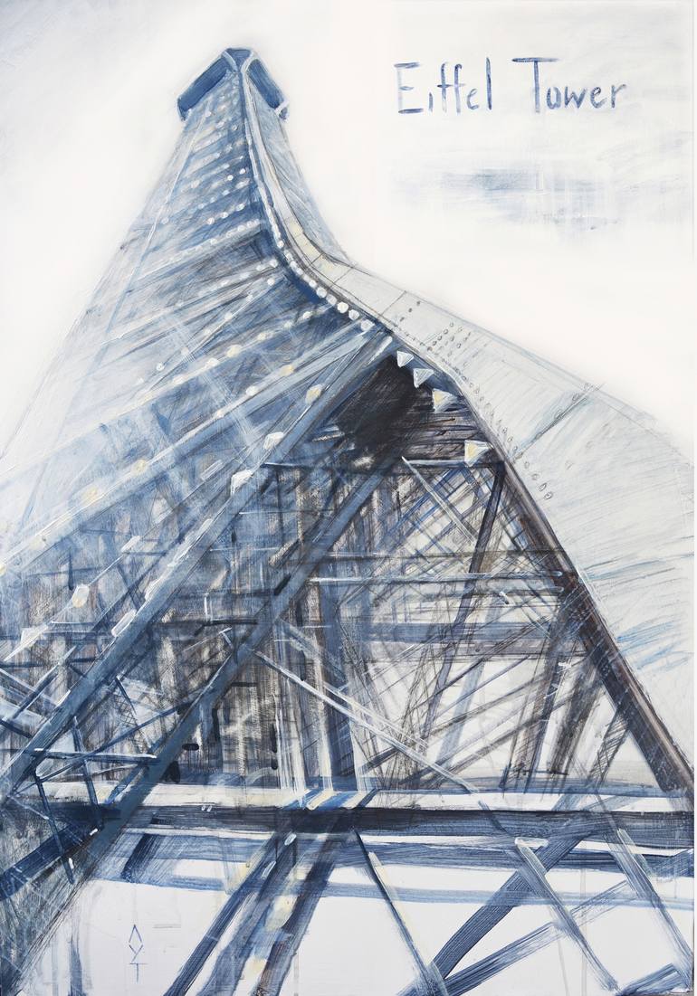 Eiffel Tower. Foreshortening. The view from the observation deck. Signed on the front and back. acrylic paint and pencil on paper