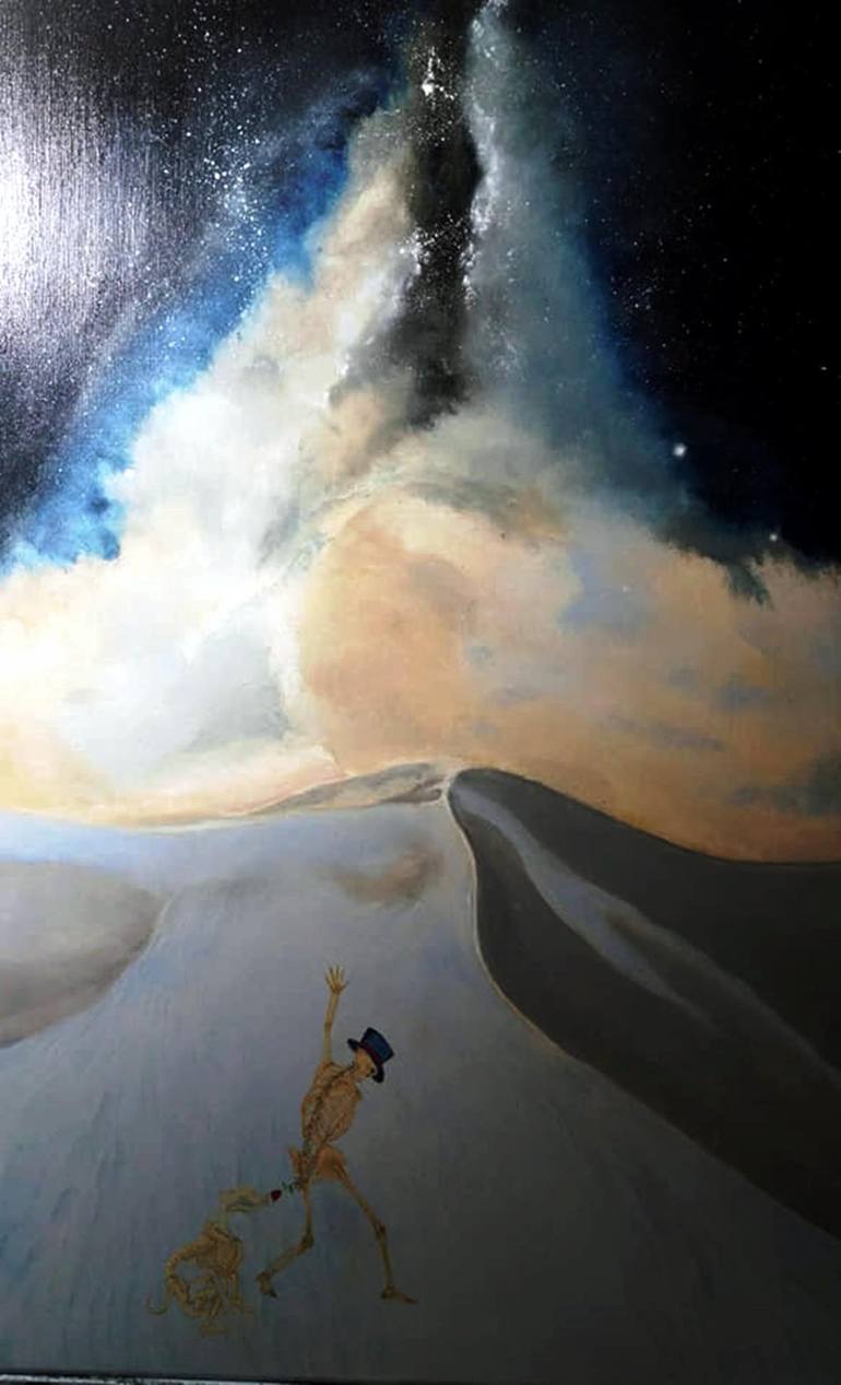 This painting, is the birth of "Charlie Wilcox" and "Hambone," his ever faithful companion Hambone, now immortal and feeling no pain. Apparently Charlie and Hambone left the constraints of mortal life, somehow falling through the Milky Way Galaxy and onto the sand dunes of the White Sands M...