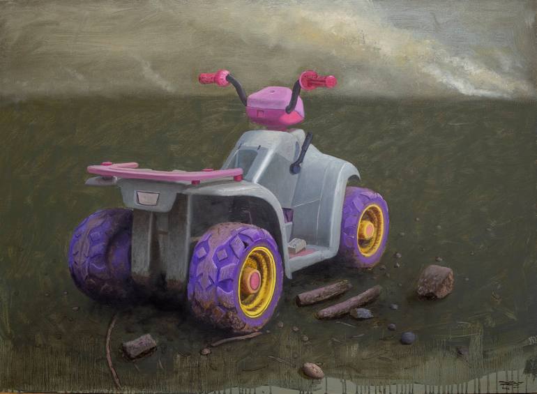 The work is inspired by antique children's toys. It is a reminder of our past. The work corresponds to a long series of works inspired by old cars that are sleeping in the landscape. The technique in the creation of the work is by layers, textures, transparencies, texture. I am interested in rescuin...