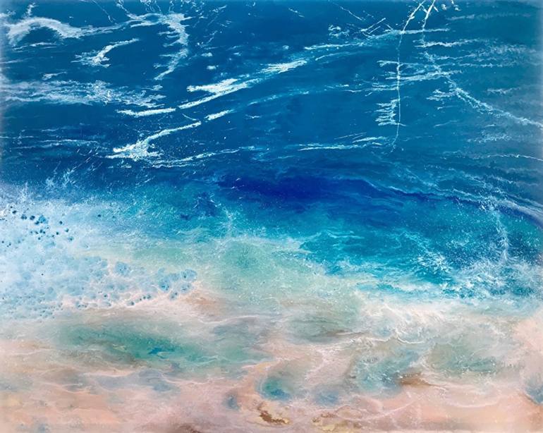 This playful painting was inspired by a recent trip to the beach, where the tide was rolling in as I was combing the beach for sea glass. I did not want to give up the search and had so much fun running from the waves! I was soaked from the knees down, but left with a handful of lovely colored glass...