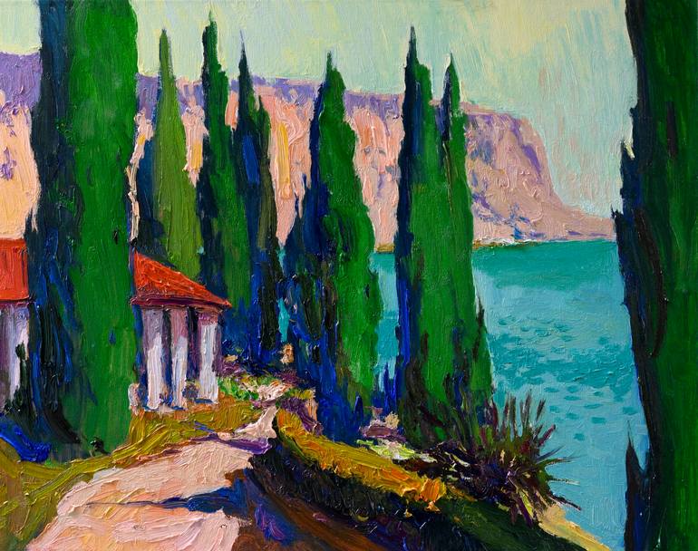 The velvet green of Cypress trees with the Mediterranean sea in the background reflects the vibe of the Mediterranean landscape. The artwork is full of life and a positive vibe. It is painted on Belgian oil-primed linen, stretched on wooden bars, and has a wire on the back to be displayed even with ...