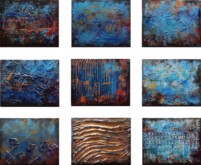 Earth, Fire and Water 75 x 60 cm 9 individual textured paintings with a contemporary and earth tones colour palette Overall Size 75 x 60cms Each painting is 25 x 20 cms Edges painted Black therefore all Ready to Hang Double Varnished for Protection Certificate of Authenticity Included © 2024 Sus...