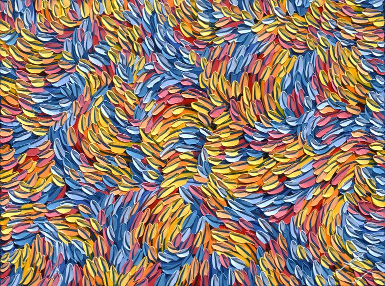 Painting is a mental, physical, and spiritual experience that takes me away to another place and time. I get lost in a world filled with vibrant color, rich texture and swirling movement. When I come back, I bring a piece of that world back with me. I am fascinated with color relationships and I obsessively experiment with the possibilities in each of my paintings. My collectors say my use of color is one of the main reasons they love my work. I paint thick, vibrant, oils on canvas influenced by the color, movement and texture found in the natural world around us. My recent paintings are designed to be hypnotic. I start with a big flowing design that keeps your eye constantly moving and returning back into the canvas. Then I develop more detailed layers that engage on a deeper level. I don’t want you to look away and always see something new each time you view it. Being prolific is something I’m known for. I have a huge body of work that has grown and changed over time. Visitors to my studio are always impressed by the impact of so many of large, original oils. I have my art hanging in businesses, hotels, restaurants, wineries, public buildings, mansions and homes around the world. I have dedicated my life to developing an original technique that utilizes the highest quality paints, canvases, tools and finishing. Although, what I am most proud of is that people say my work makes them happy.