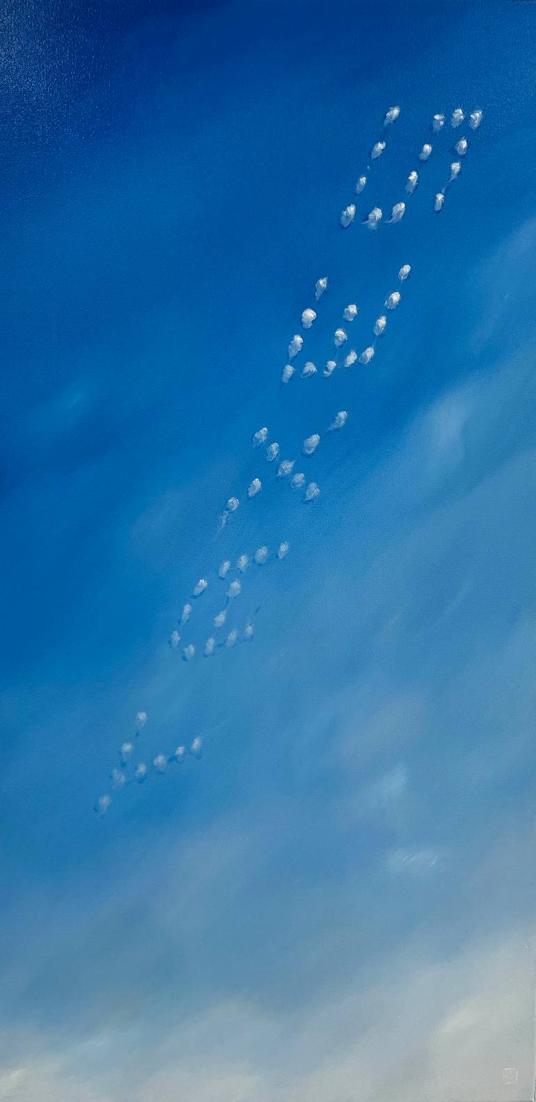 "Easy Struggle" is a captivating oil painting on wood-backed canvas, a unique piece that blends surrealism, symbolism, realism, and contemporary styles. The artist masterfully recontextualizes a fragment from a sky typing advertisement, inviting viewers to contemplate the message. The painting feat...