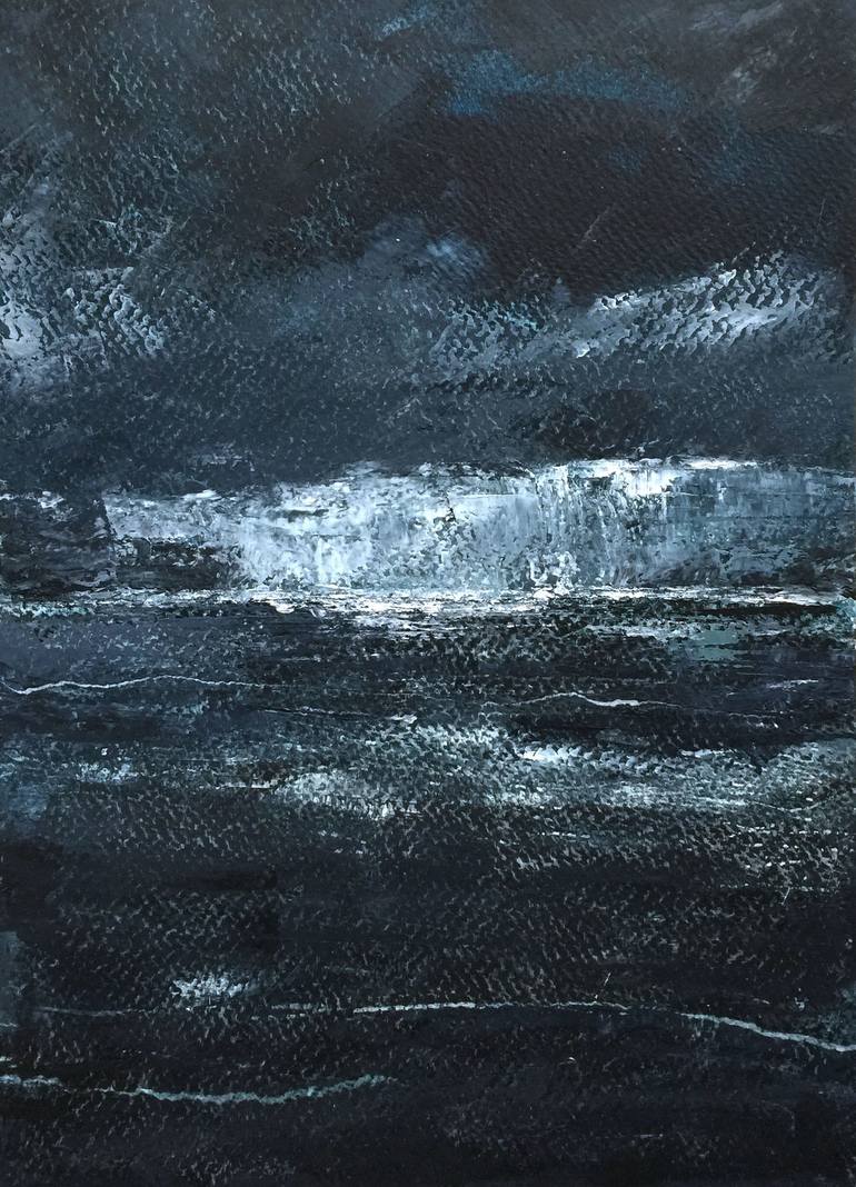 Ebb and Flow is an original oil painting on paper of a stormy seascape created with a palette knife. It has a rough texture and an array of blue tones. Framed and ready to hang in a white 12"X16" frame. Signed with a Certificate of Authenticity.
