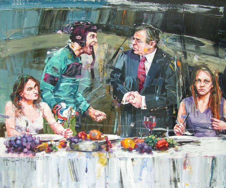 MARTINHO DIAS, (b. 1968) is a Portuguese artist. He have a Master degree in Fine Arts - Painting, by Oporto University. Martinho Dias was illustrator and teacher of Visual Arts until 2009. Since then, he started to dedicate himself full time to artistic activity with works represented in several publications. His work has been distinguished and displayed in many individual and collective exhibitions, both in Portugal and abroad. ______________________ "My work is mostly figurative and my main theme is a social one, playing with society's different powers and privileged social layers, mixed with a generous portion of irony and humour circling many paradoxes". My initial material and subjects are manly from press media, art history and Internet. I am a manipulator and I am also an image/context ‘agitator’, contributing to reality new meanings and narratives. The photographic images are used as "models" to my pictorial compositions. What I do consists of removing several of today’s leading public figures of their comfortable sets offering in return, as often as possible, some degree of discomfort". (Martinho Dias, 2015) The process: "I don't usually make preparatory drawings and sketches on paper; it is more convenient to work with the brain. Besides, at a certain point, computer has become an excellent tool at the initial phase of each new project. This initial moment of the process is crucial for defining the central idea of the painting as well the elements that will give it shape. _______________________