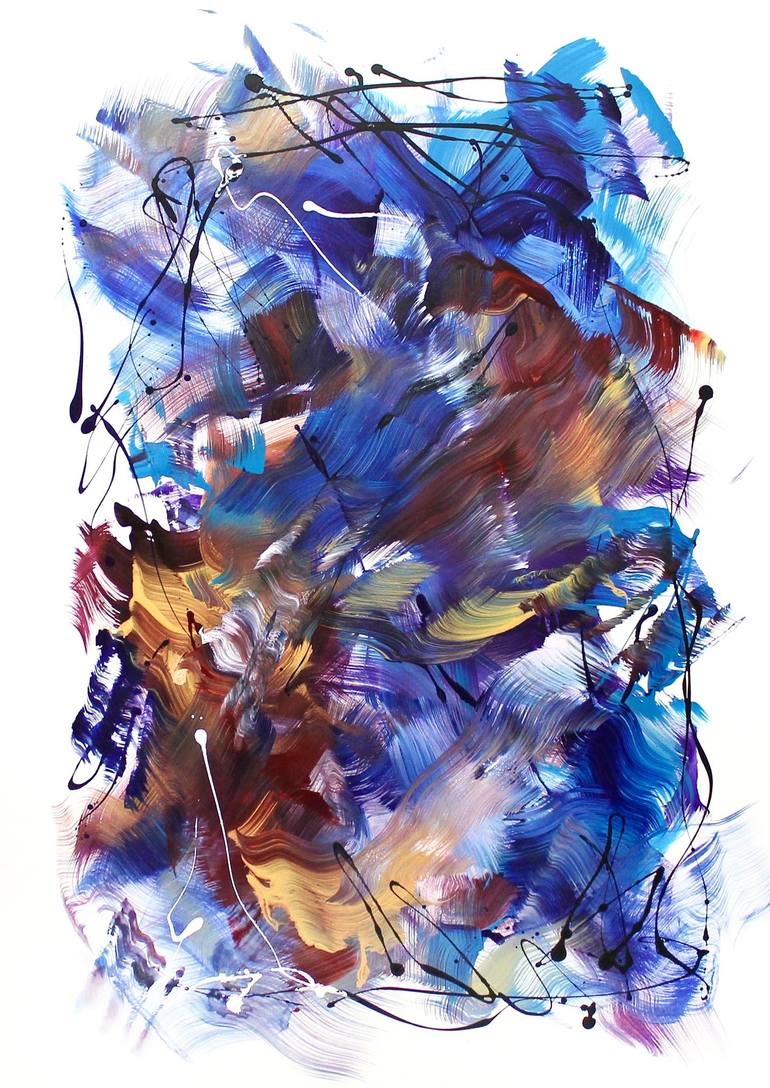 "Echoes of the Sky" is an expressive abstract painting that captures the fleeting beauty of sky and light through fluid, gestural brushstrokes. Set against a crisp white background, sweeping layers of blue, gold, and bronze move across the canvas with a sense of effortless rhythm and emotion. The c...