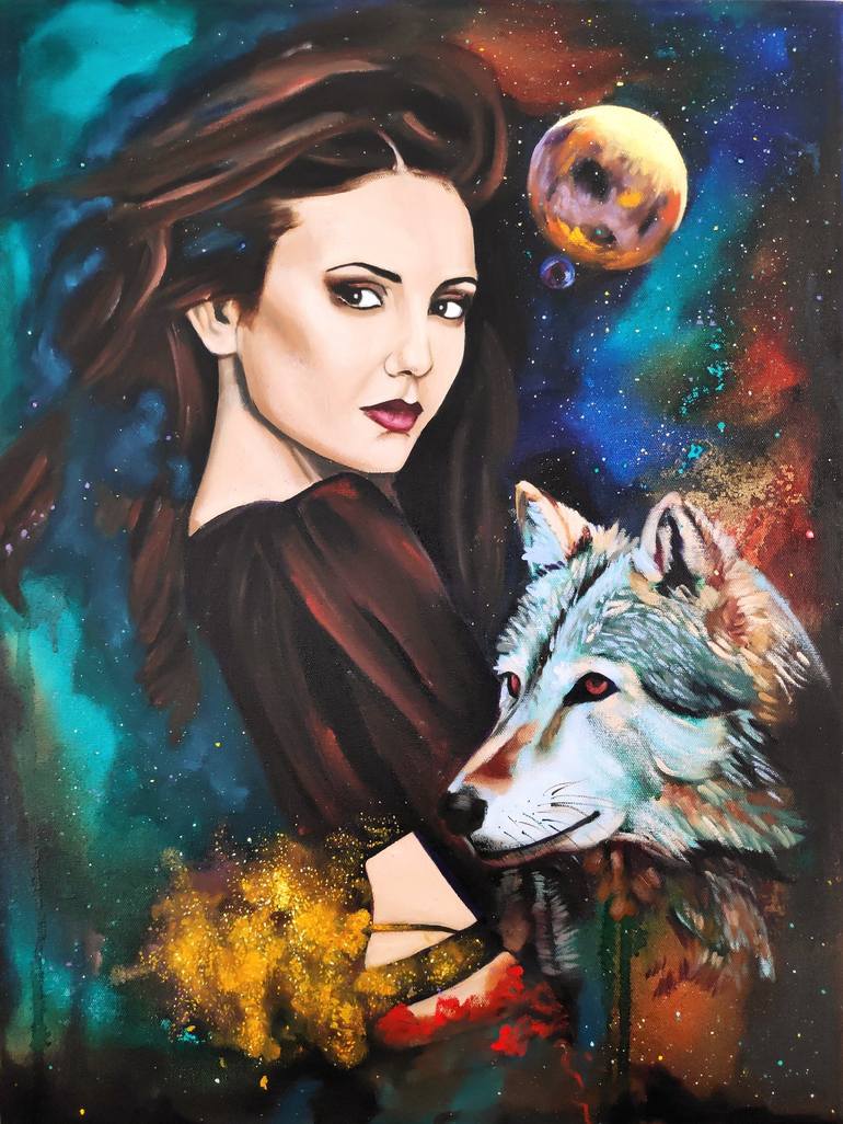 "Eclipse" is a mesmerizing painting blending reality and imagination. Featuring Elena Gilbert from Vampire Diaries alongside a majestic wolf, the cosmic background in deep blues, greens, and earthy tones creates a captivating atmosphere with stars and a breathtaking planet. Using acrylics, inks, an...
