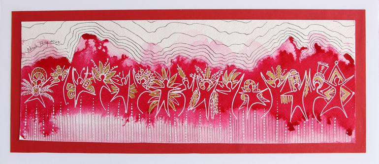 Created in red, white, black (the national colors of the Trinidad and Tobago flag) and gold, it is a depiction of the energy of Carnival masqueraders. This painting comes from a unique collection of 20 paintings called Wild and Free Spirits. The masqueraders are portrayed as spirits not defined by r...