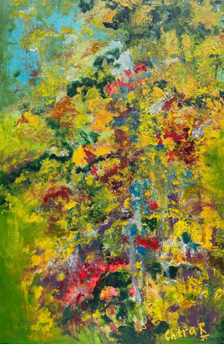 This painting was inspired by the flora present in my self created garden, and gardens and flowers in general. Created in a loose spontaneous manner, this colorful painting is an expression of my love for nature and was created outdoors shortly Inspired by Claude Monet's garden in Giverny, France ...