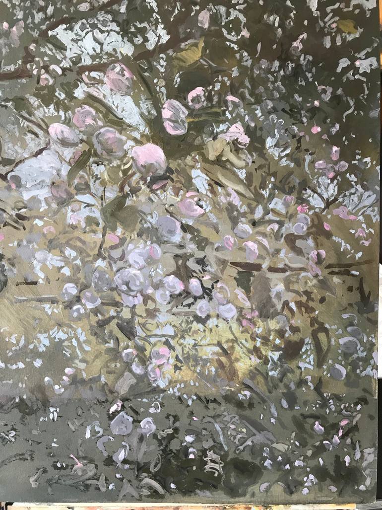 The utter simplicity of form and gentle colors that I was wait for had finally arrived. Each spring I am renewed by the freshness and purity of this very old tree I applied the paint freely imitating the dappled light and swaying orbs trying to translate the spirituality of what was in front of me.