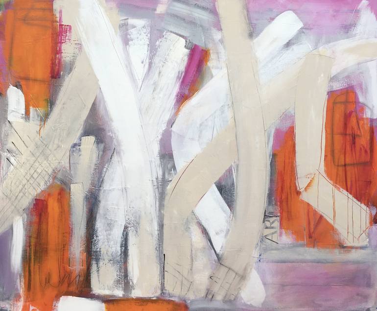 Here the artist has created an extraordinary work of art with bright colors, trendy orange and a special composition with a lot of structure. The many layers suggest a wonderful depth. The lettering that can be seen in the painting and the idiosyncratic broad brush strokes have inspired the artist t...