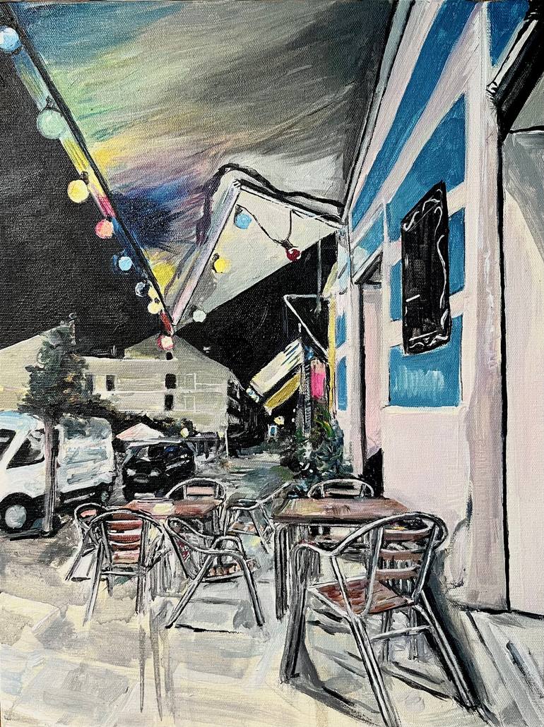 I did this painting because I love that place; it’s friendly, service is always good and it deserves a beautiful painting so we can always remember it. I used acrylic on canvas as it’s part of an advent calendar that I paint during Christmas, painting one painting a day.