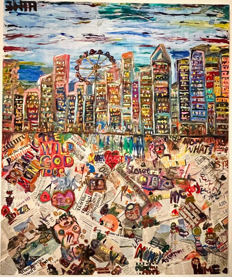 Inspired by a photograph of the London skyline taken during a walk along the Thames Path, Hime weaves her reflections on the financial and political turmoil facing the UK into this piece. Through a fusion of painting and fragments from British newspapers, she explores the impact of money on the City...