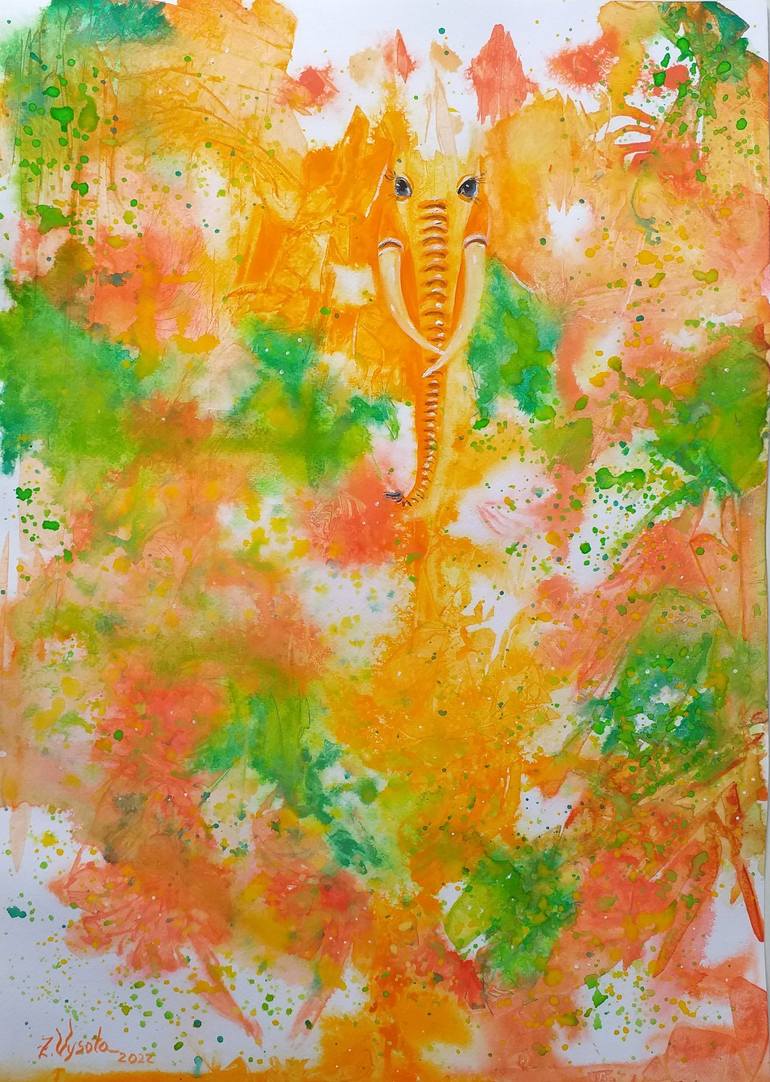 --- Elephante in the jungle. Through the thickets of the junle, under the rays of sun, a huge elephant walks with his bold gait. This is his land,he is on his own territory, he has nothing to fear. --- This unique and exclusive watercolor painting, hand painted on 300gsm 100% cotto...
