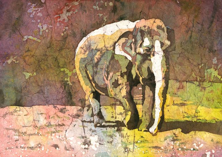 Elephant watercolor batik landscape painting art for kids room handmade item travel essentials African safari gift for her. Original Painting 12x16" on Japanese rice paper. Mounted on 16x20 Kool-Tack reversible foam core. Unframed. This painting is based on the artist’s original travel photograp...
