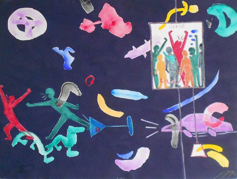 This work was inspired by the frenetic action of everyday working life for many people. Trapped in the elevator going to your office, the race to and from work, the wild chase for freedom once you're finished. It's all depicted here in this wonderfully colourful, wild and humorous view of life. Done...