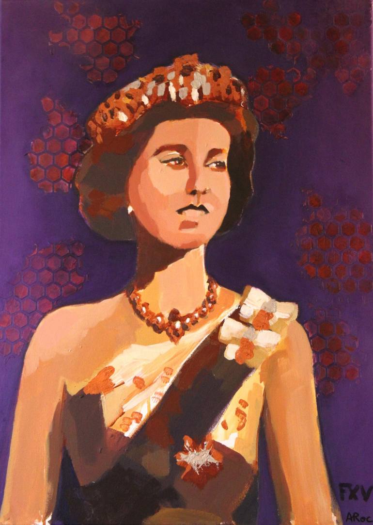 This artwork was created in collaboration with Aurélie Rocheta. A youthful Elizabeth II appears to emerge from the purple background adorned with honeycomb motifs. The contrast between her highly formal attire and the pop art background highlights the apparent paradox of the Royal Family's influence...