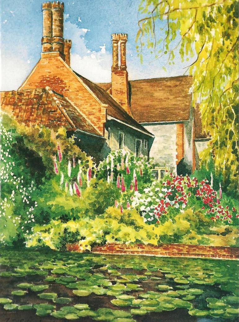 Elsing Hall in Norfolk used to open it's grounds to the public, so I took the opportunity to paint amongst the gardens. This view particularly caught my eye. I love the water with water lilies in the foreground and was able to frame the scene with the weeping willow on the right.
