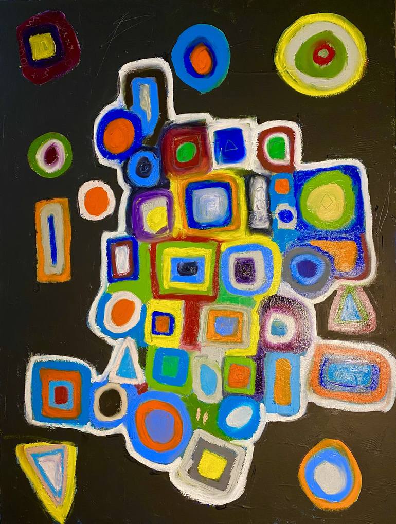Geometric shapes un-tethered to the sides and unrestricted in their organic nature float within the background owing to the absence of or complete absorption of light. This painting embodies the freedom to just be present.