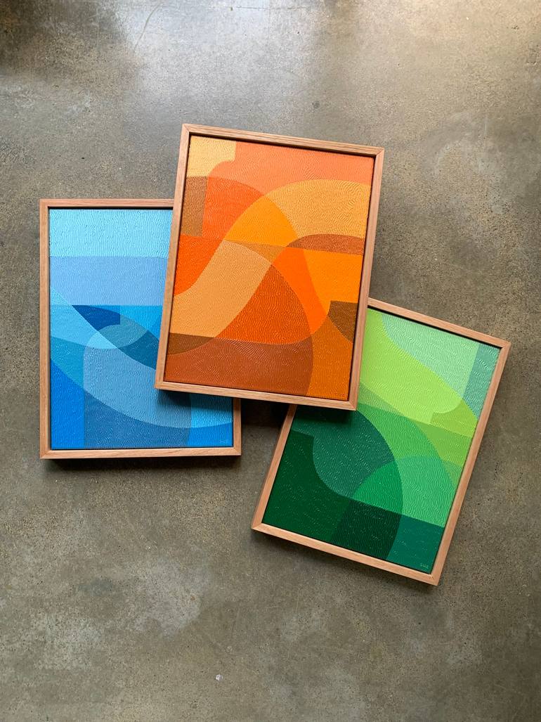 A triptych with adventure, journeys and travel as a linking theme. These artworks invite the viewer to touch the paintings where they can feel the intricate hand painted line work, a method unique to the artist. ‘Embark, Voyage, Safari' are all one of a kind original pieces, framed in Australian T...