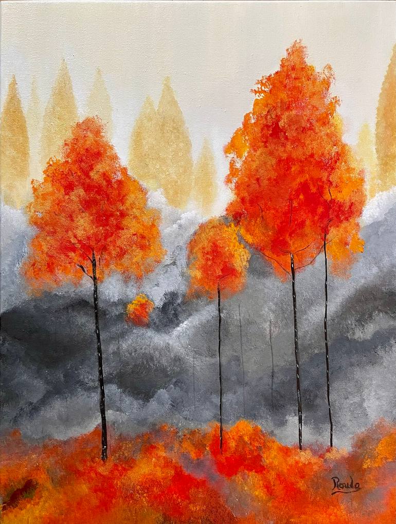 This painting captures the ethereal beauty of an autumn landscape with vibrant orange-red trees standing tall against a misty, golden-hued background. The contrast between the fiery foliage and the deep, stormy grays of the middle ground creates a dreamlike atmosphere, as if the scene is suspended b...