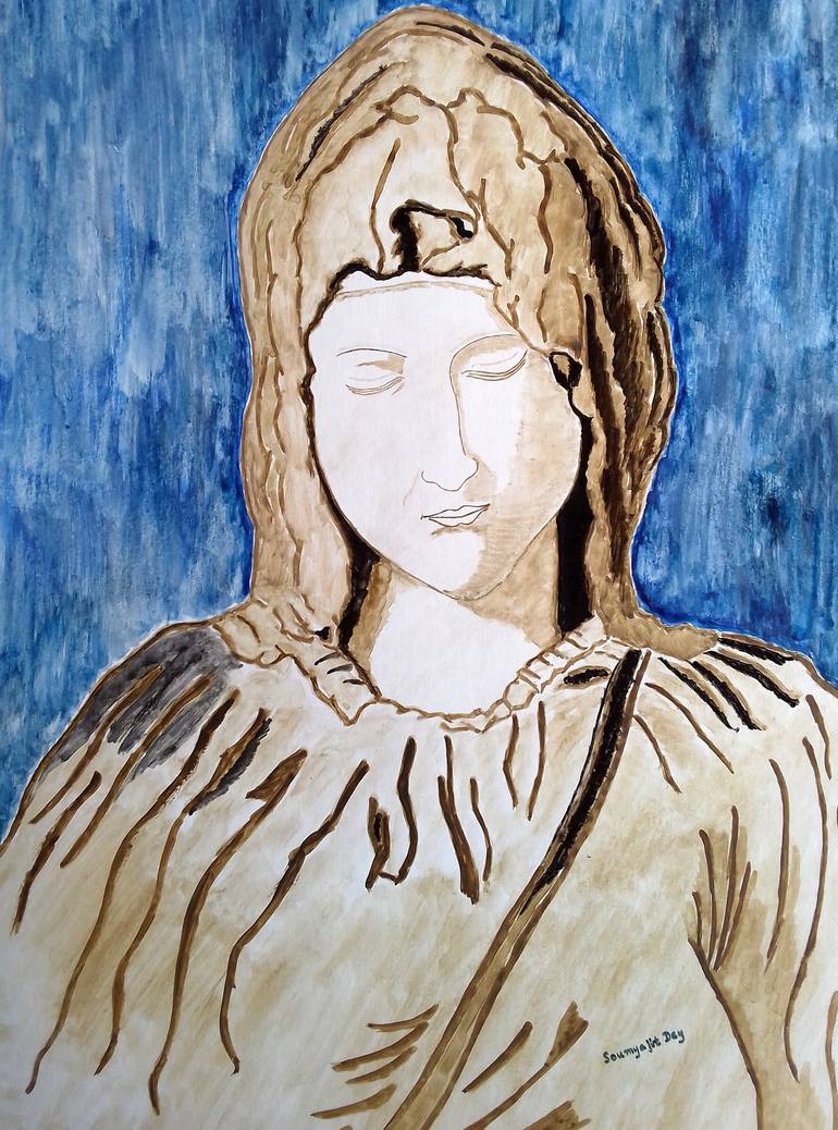 It is a depiction of mother Mary as shown in the sculpture 'Pieta'.This painting was done using water color.