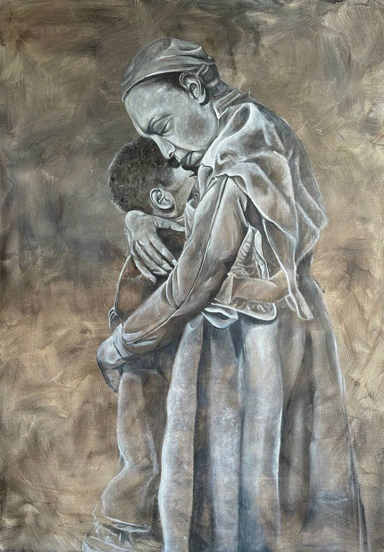 At the heart of this painting lies a mother's unwavering devotion to her child, a testament to the boundless strength found within vulnerability.