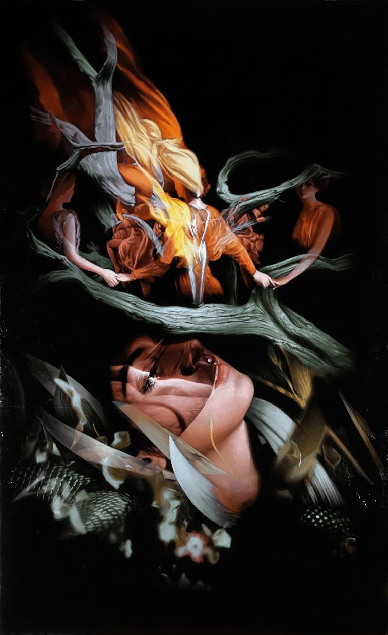 Nam Das creates open-ended visual stories where the narrative revolves around Jungian archetypes and mythologems. He uses a limited palette in his oil paintings.