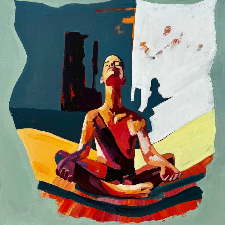 This painting reflects the joy of existence, space transformation, and meditation. The figure sits in a meditative pose, arms raised, embracing the energy of the universe. Surrounded by bold colors and shifting forms, the scene feels fluid, as if reality itself is expanding. The circular glow behind...