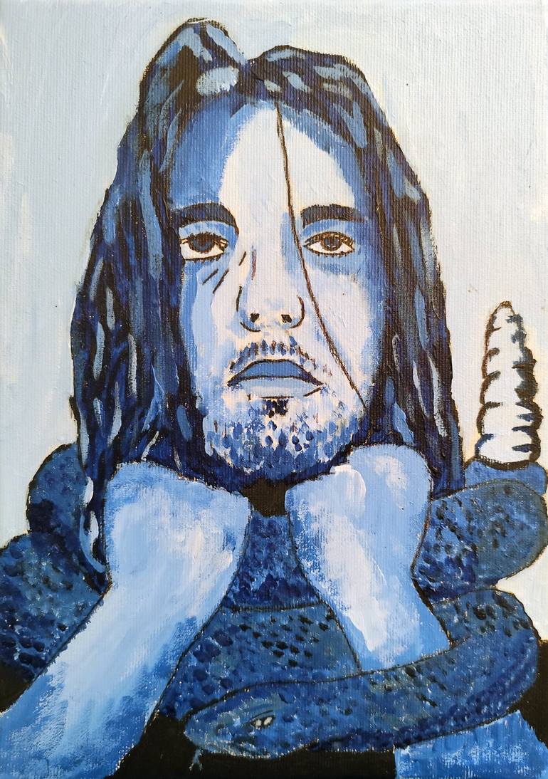 "Dark Embrace" is a powerful oil on canvas painting that explores the theme of depression with profound visual intensity. Rendered in a monochromatic palette of blue tones, the piece portrays a man with a melancholic face, his eyes revealing a deep, silent pain. His arms appear to be wrapped by a se...