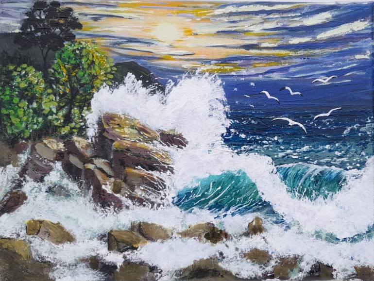 Seascape in illustration style. I planned a quiet, calm sea, with surf on the rocks