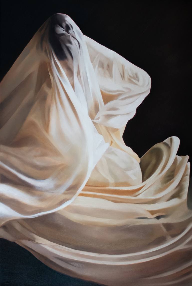 I am a Santa Cruz California native, now living in rural Idaho with my husband and 2 young daughters. Artist Statement: The fabrics in my work represent the complexities of human emotion. A blend of my love for old master paintings of drapery and mystery, with my own connection to the symbolism of fabric. Using dramatic lighting and dynamic movements in the fabric veiling a figure is a means of self expression and inspiration to the viewer. Showing glimpses of the figure in each piece provides humanity and relatability. While also retaining ambiguity, the viewer can form their own opinions on what they see. The weight, transparency, and trajectory of each layer provoke feelings and questions, much like the stimuli of our lives. Early in my artistic journey, I was introduced to the iconic dancer, Martha Graham, and her performance ‘Lamentation’. I continue to be inspired by her piece and much like Graham, my work uses fabric as a medium to express emotion as well as reference the metaphorical meaning. Light and form are also fundamental elements pushing me toward each composition. Whether it be refracted light in the shadow of each fold or the light shining through the sheerness of the fabric. This luminescence gives an enchanting quality to my work.