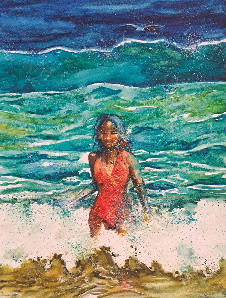 Woman walks out from the healing sea water, waves crash around her as she emerges refreshed and renewed