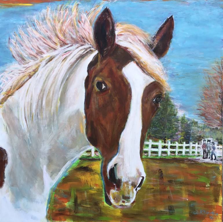 Say Hi to Emily. She is a Paint horse. The wind was blowing quite hard this day and her mane was caught up in the breeze. I was curious what she was thinking with the 3 figures standing in the background. I captured this day with a beautiful blue and orange colored sky. You can see the wind blow...