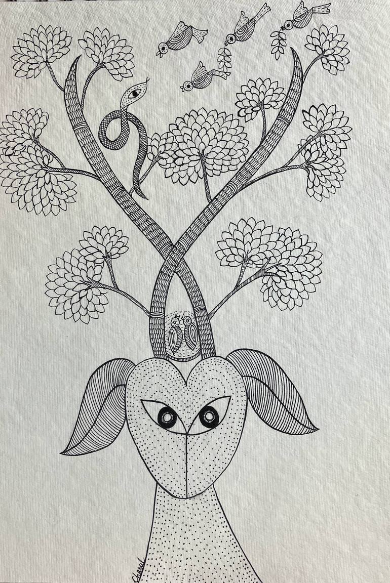 Gond art is a traditional and vibrant form of Indian tribal art originating from the tribal communities of central India. Known for its bold, intricate, and colorful designs, Gond art often depicts nature, wildlife, and folklores. Here in this painting the artist has visualized that in a peaceful f...