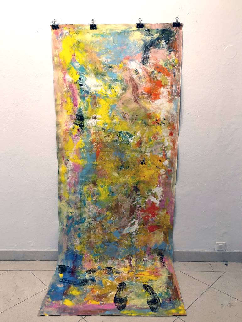 Encounter is a new painting, from my newest series Invisible Ties. "The painting Encounter (Srečanje) is entirely a multi-layered, dynamic structure of expressive colour movements and stains. Only in the lower part of the canvas, which extends to the ground, towards the spectator, we notice the sho...