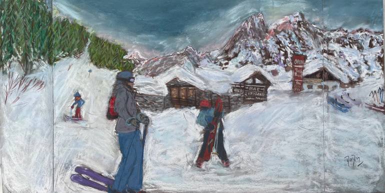 This picture is based on a couple of my photographs from a past trip to Courmayeur. They were taken at the end of the day, when my family and myself were coming down the mountain, on the side of Val Veny, which is much quieter than the main Plan Chécrouit side. We were rushing to get to the funicula...
