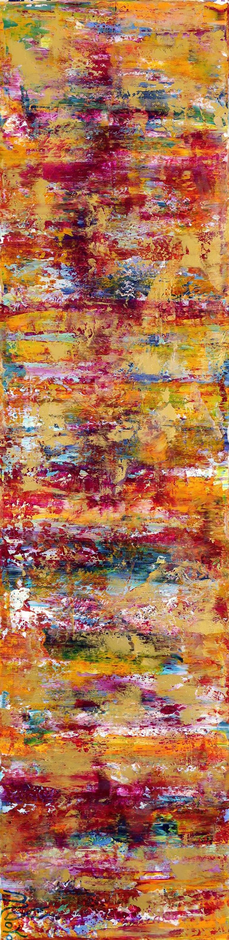 This unique one of a kind artwork was painted in my Los Angeles studio. For this painting I used layers of drizzles in yellows, orange, and rich gold with a layer of fine iridescent particles with flares in teal and subtle blue details. This is a true statement piece which will arrive signed on the ...