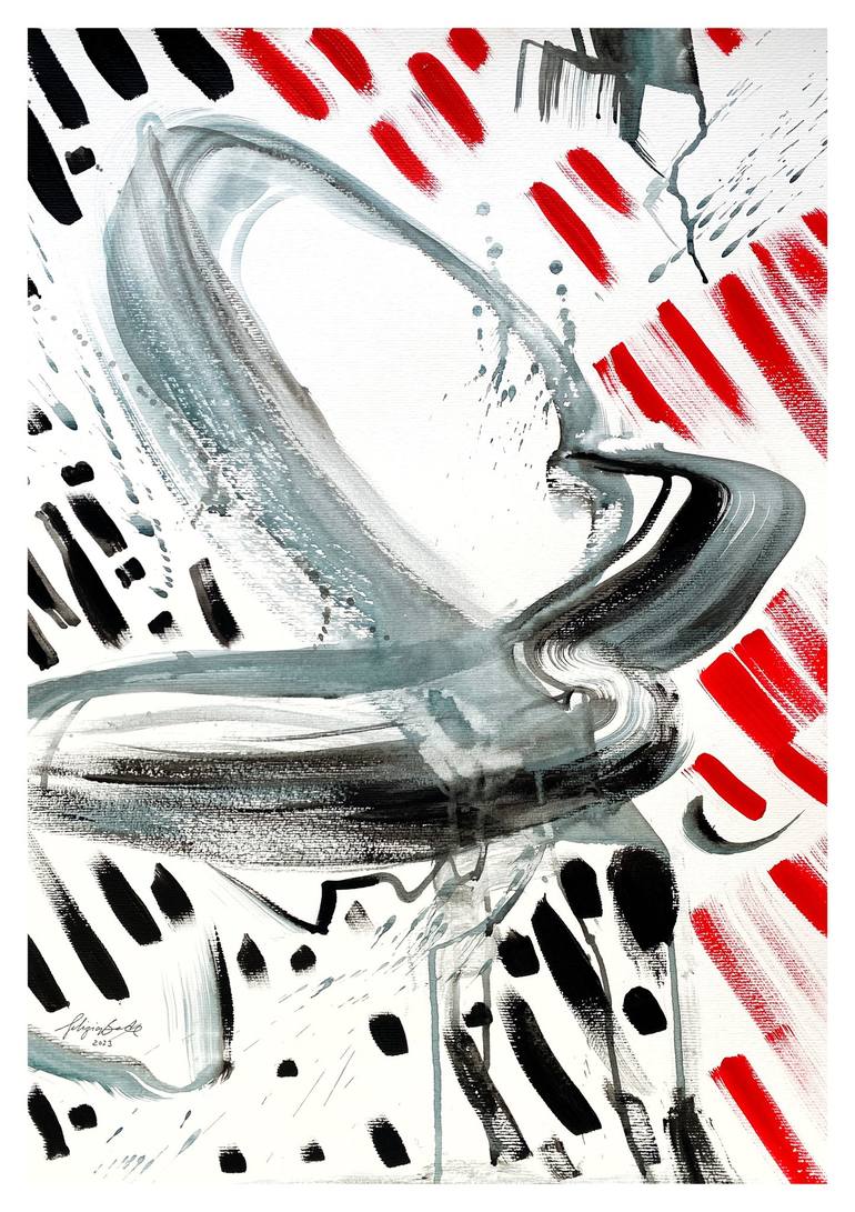 Sometimes I like to allow myself anything on paper or canvas and don‘t overthink it. Just do it. This is one of those paintings. Often they have a certain energy or mood about them. The twin painting is „Explosive“.