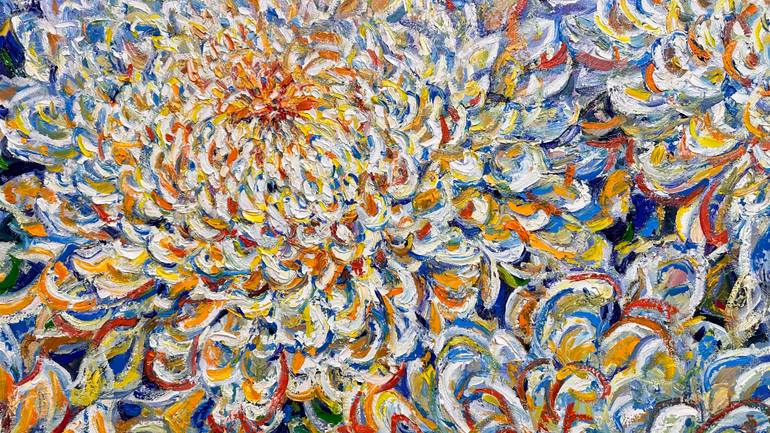 This exquisite painting, Enjoyment, features a close-up view of pristine white chrysanthemums. Each delicate petal is rendered with meticulous detail, highlighting the flower's natural elegance and purity. The artist employs a refined technique that emphasizes texture and light, creating a serene an...