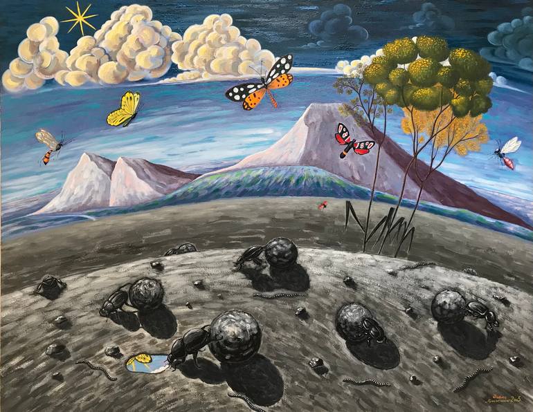 Surrealist landscape painting depicting a dynamic scene of nature's harmony and mystery. Vibrant butterflies fluttering amidst dramatic mountain peaks, alongside beetles rolling symbolic spheres under a starry sky. This dreamlike artwork blends surrealism and realism to create an engaging visual nar...