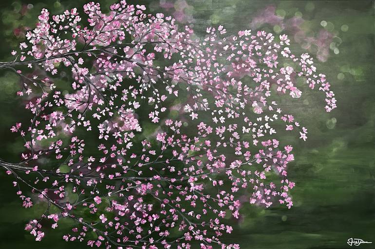 Deep green bokeh background sets the stage for the beautiful Japanese Cherry Blossoms starting to bloom in Vancouver. Spring is a time for renewal and new beginnings, this piece offers a moment of peace and contemplation. This is an original painting, hand painted with Professional grade heavy body...
