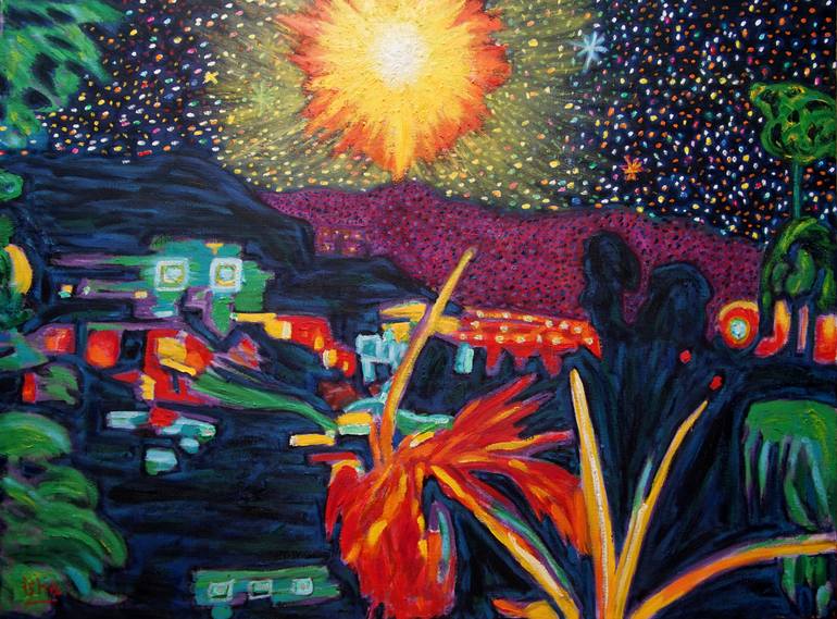 An imaginary nightscape of Christmas eve night over Cabo San Lucas. This is an original oil painting, signed and dated with a Certificate of Authenticity. I ship flat and it is un stretched.