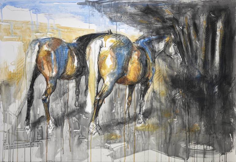 Art painting of two horses who rest under trees. ::: Medium: watercolor, pastels, black chalk and gesso on paper on canvas (without frame), finished with a varnish, signed on front. Sent rolled in a tube. Painting done on stretcher but I remove it for the sending (Don't hesitate to contact Saatchi ...